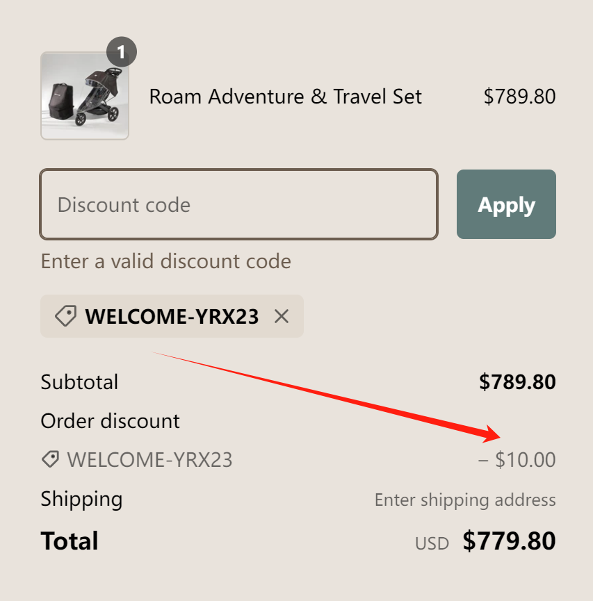 3. When you are ready to checkout, click the cart. Enter your discount code in the box called "Gift card or discount code" and hit "Apply”.